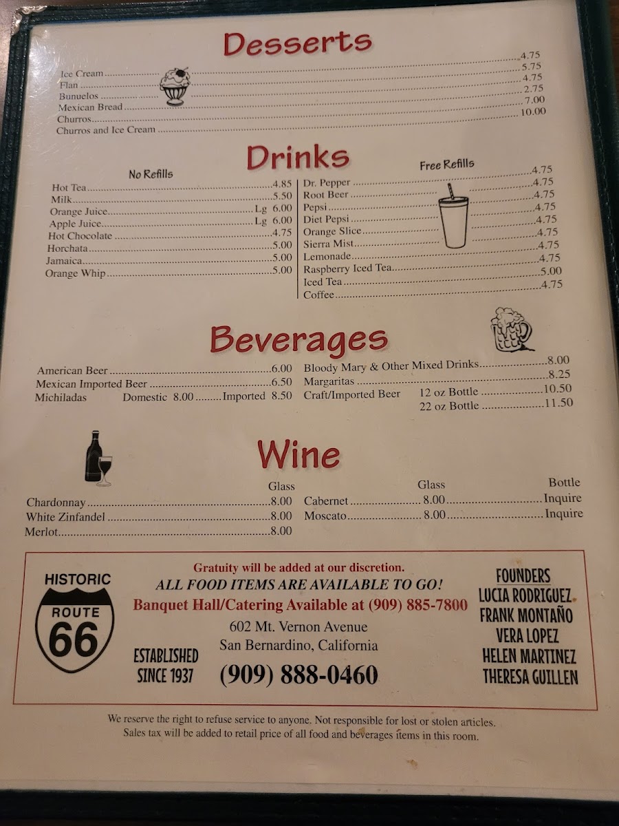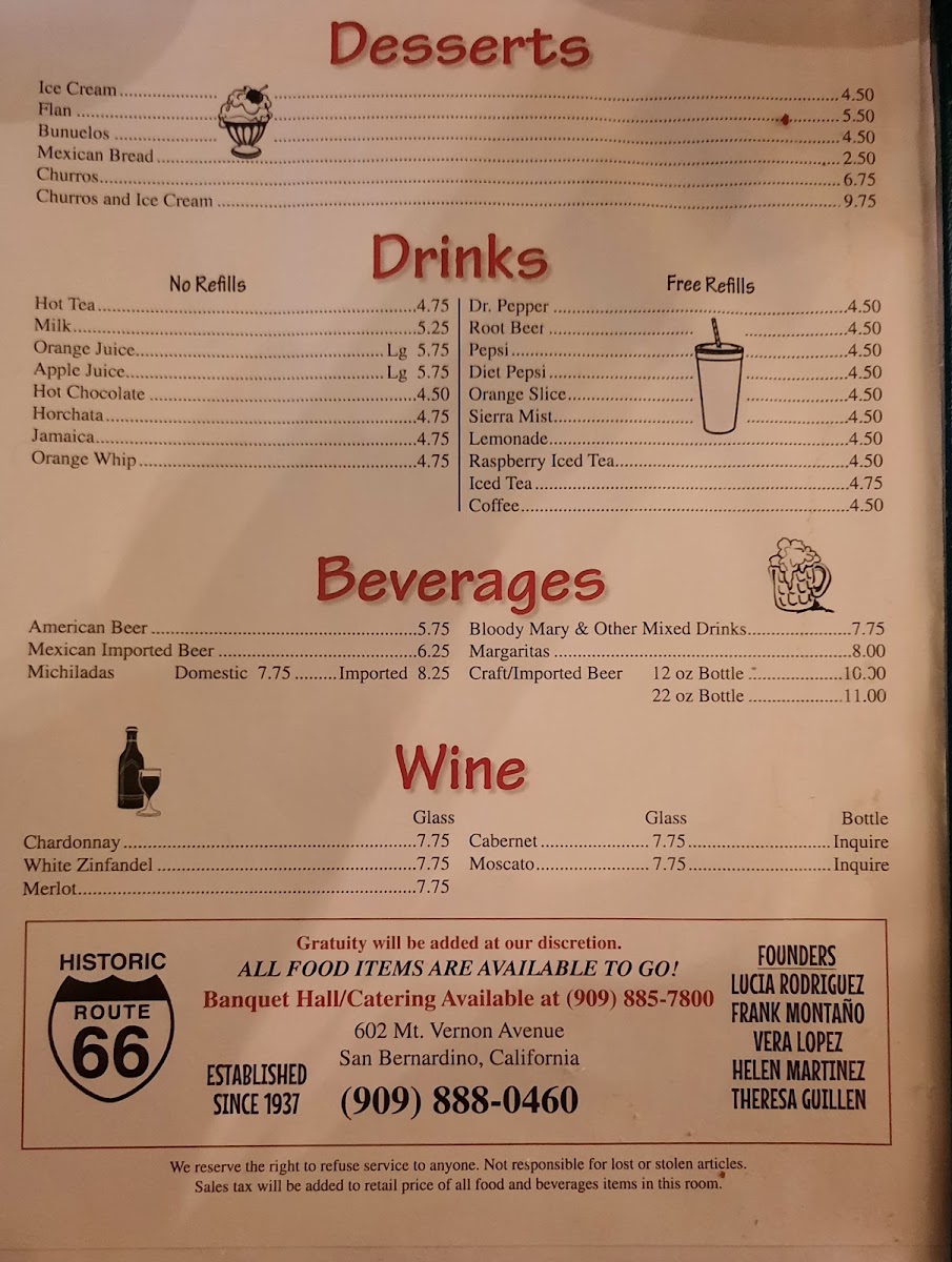 Drinks complement the menu’s approachable vibe, featuring margaritas in flavors like mango, alongside traditional mixed drinks including Bloody Marys. Dessert choices keep things familiar and comforting with churros, flan, and Mexican bread rounding out the experience.